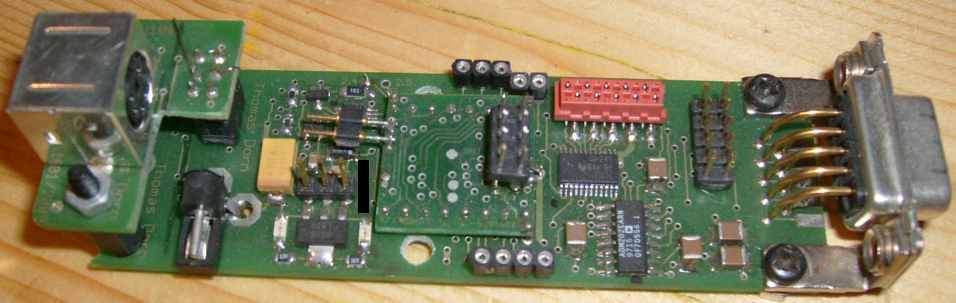 Entwicklungsaufbau und Prototyp (32 x 60)mm, (Debug-Interface von TI)